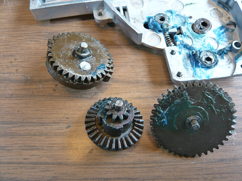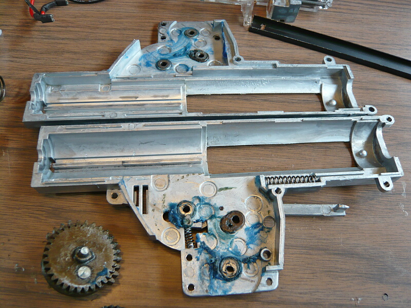 まず目につくのが青いべったべたグリス。粘度が高くアンチウェアグリスの類でしょうか。ちょっと前の中国製電動ガンに多用されていた緑グリスのように全然接触部分じゃないところに山盛りにしてあったりとかはしないのですが、素人目にも適切に盛られている感じはしません…