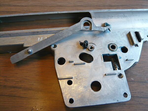 カットオフレバーはメカボックスの外側からネジ留めされているのでこれを外します。
