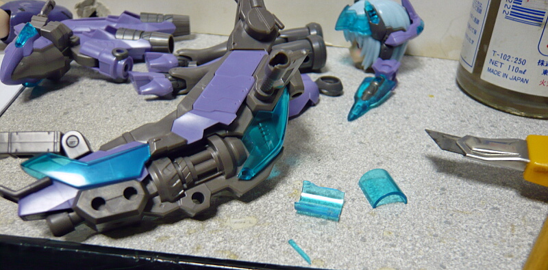 背中の武装にあるシリンダーを覆っている透明パーツを剥がそうとして、割りました・・・この透明パーツは予備が2つあるので割っちゃった1個は置き換えられますが、塗ってからハメた方が良いでしょう。