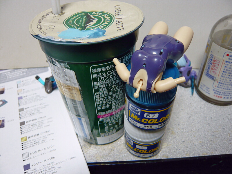 胴体や胸元のセミグロスブラックを塗ったところに青竹色に白を混ぜたもので塗ります。カップコーヒー飲まなくなったのでフタの残量が乏しくなってたためケチってマウントレーニアの上面で混ぜていますが、事故ってこの上に尻から落としてしまったのでちょっと失敗。混ぜた塗料を破棄した後に胸下の色を触って潰してるのに気づく・・・変な事はするもんじゃないわ。