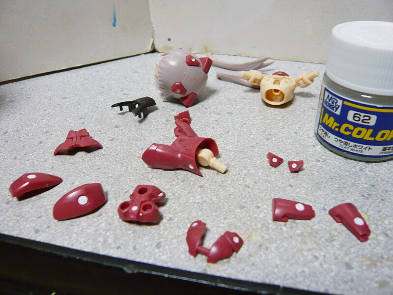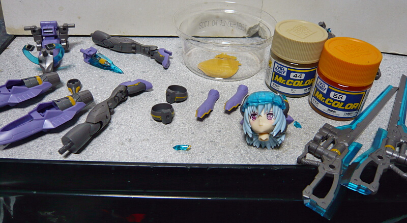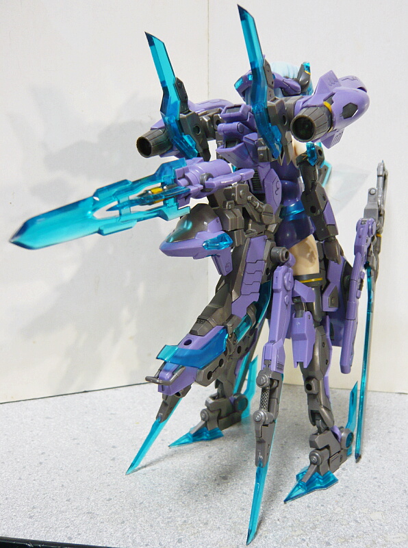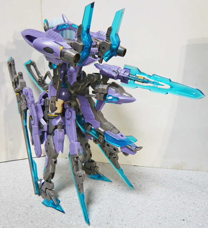 一応完成。デカールを貼った二の腕のパーツと太もも前のポッド状武装パーツは半光沢のトップコートを吹きました。何かこの子はあまりつや消しにしたくなかった・・・
