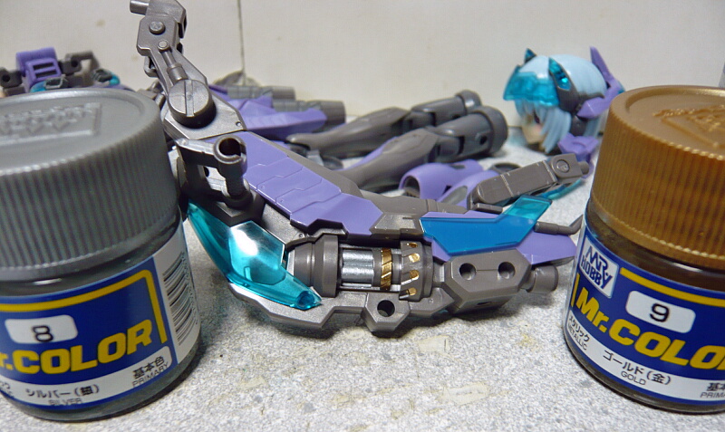 シリンダーを8シルバーと9ゴールドで塗ります。キラキラ感を強めようとガイアカラーのスターブライトシルバーやゴールド、ブラスを引っ張り出して来たら溶剤が飛んでて使えるようになるのに時間が掛かりそうだったのでパス。透明パーツ嵌めちゃうとあまりキラキラ感わからなくなりますけれども。