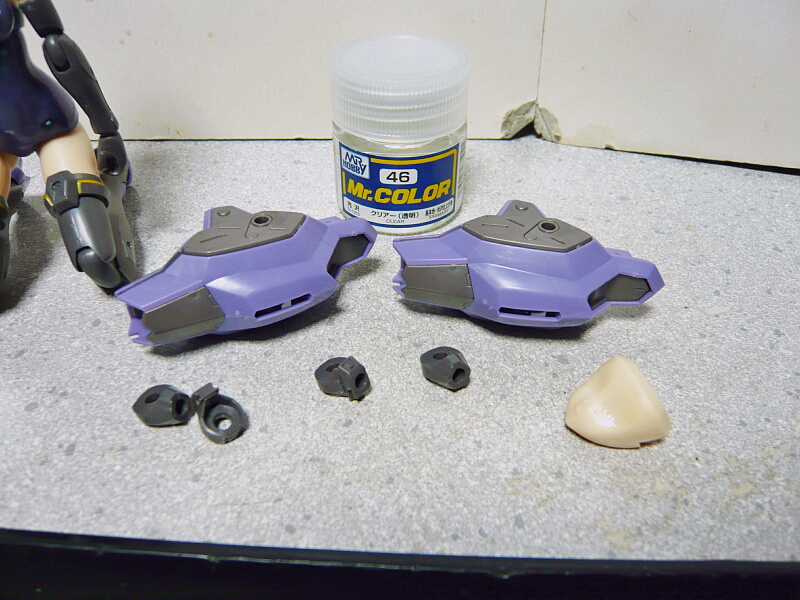 デカールを貼る面にあらかじめ46クリアーを塗っておきます。つや消しの上にデカールを貼るとシルバリングするし、プラ素材に直接貼ると食いつきが悪いためこうします。よく見たら太もも前のポッド状パーツ、デカール貼るのは右側だけだった・・・無駄な事を。他、二の腕に付くパーツに黄色い「<」のデカールを貼るので、ここはパーティングラインがあるため処理してからクリアーを塗りました。更に目が印刷されていない顔パーツの上半分も。
