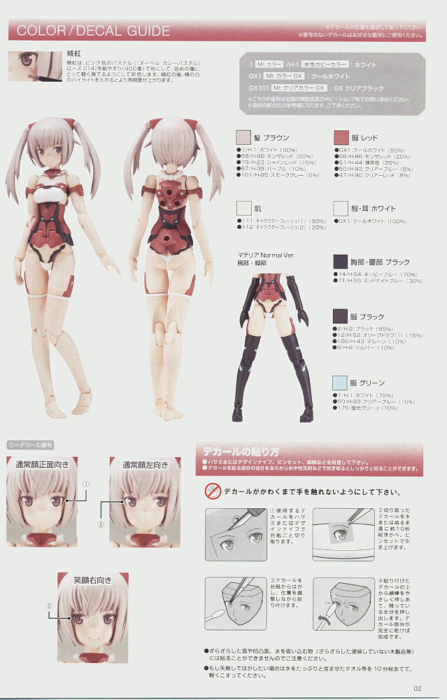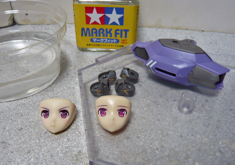 付属の塗装済み顔パーツは眉がいかつい角度のものしか無いので、デカールの目と眉を切り離して眉の角度をハの字寄りにします。