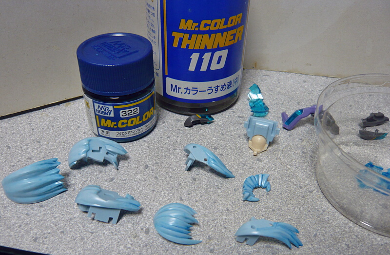 髪にスミ入れをします。何となくで322フタロシアニンブルーを溶剤でシャバシャバにして谷部分に軽く流すようにし、上を薄く下を濃くするように伸ばして調整。エナメル塗料の方がきれいにできるハズですが、ここはまだラッカー系でやっちゃう。