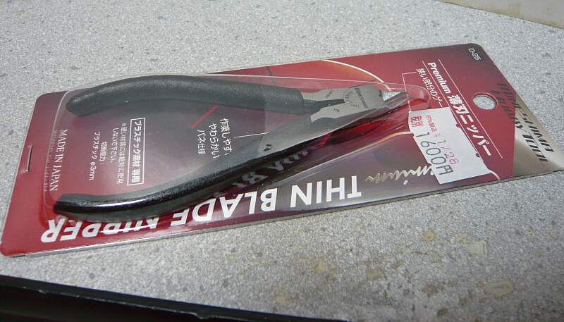 その前に、古い方のタミヤ薄刃ニッパーをちょっとつまらない事で先端を欠けさせてしまったのでニッパーを買い足しました。何かタミヤの薄刃ニッパー、種類が増えててジョーシンの店頭で「どっち買ったらいいんだろう?」と迷ってしまい、じゃあ気分転換に他社製品でもと見ると隣りにあったのがこのミネシマの薄刃ニッパー。値段はタミヤの薄刃ニッパーが1800円ほどだったのでちょっと安い。似たようなもんだろう、とこちらを買ってきました。