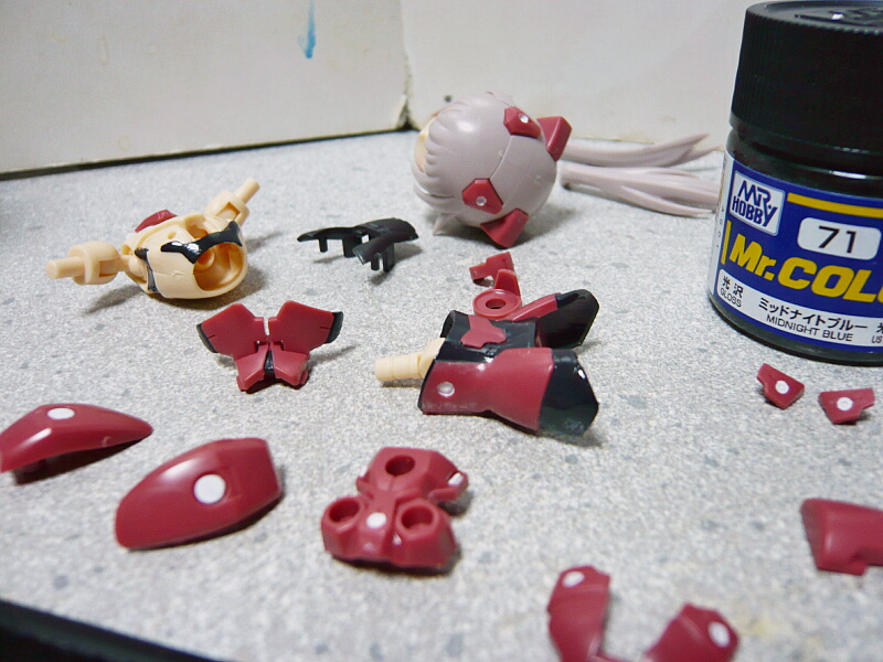 次に黒い部分。イノセンティアの黒い部分の成型色はシルバーが含まれていて少しメタリックなのですが、パッと見はつや消し黒に見えます。ミッドナイトブルーで丁度良い色合いですが、ツヤがあるので後でつや消しトップコートする事にしましょう。