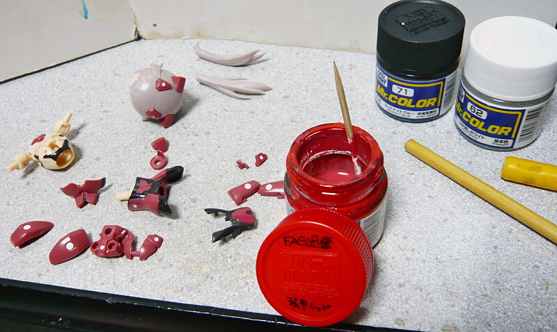 赤い部分は調色を要しますが、迅雷の赤を瓶で作ってあったのがほぼそのまま使えました。といっても必須なのは轟雷バリエーションではいつも目立つ位置なのに塗装を要する腹部分。