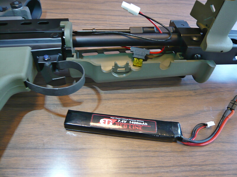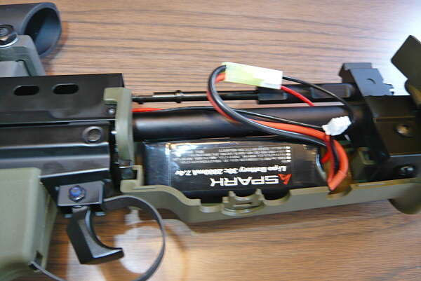 ハンドガードを開けてバッテリ―を収めます。コネクターはタミヤミニタイプ、ヒューズはミニ平型のものが付いています。