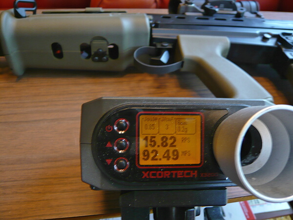 初速は92.5m/s、サイクルは秒15.8発。この銃はメーカー出荷時点で良いモーターが入ってるとの事で調整メニューにサイクルUPが設定されておらず、集弾性UPのみ。もちろん標準的な初期調整はされているので変な音もせず、調子良く動作します。動作音的には普通のスタンダード電動ガンなのでマルイのドノーマルと似たシュタッ、シュタッという感じの音。バッテリーを充電すればもう少しサイクルは速いかもしれません。集弾性はさすがに調整されているだけあってSUSATのレティクル先端のちょっと右(SUSATはポン付けで未調整)に何度撃っても同じところに着弾します。
