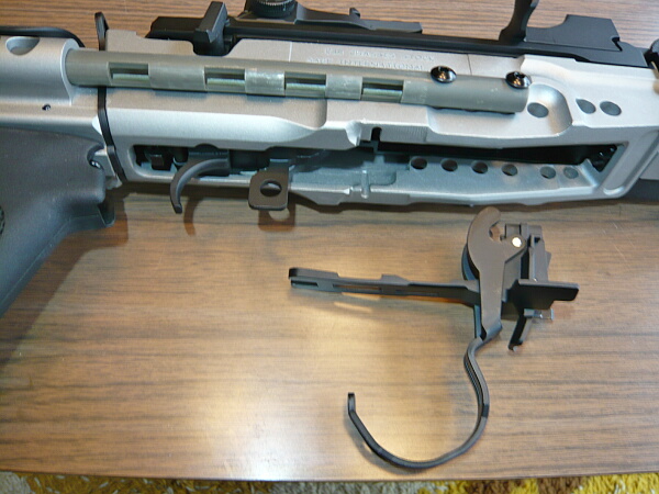 トリガーガードとマガジンキャッチが一体になったパーツが抜けます。大体トリガーガードを引っこ抜いた勢いで全部外れてきます。