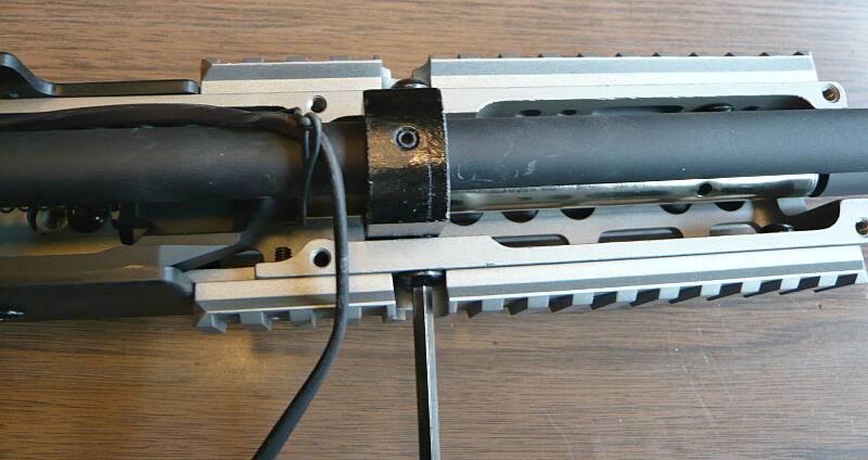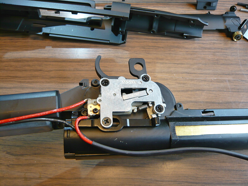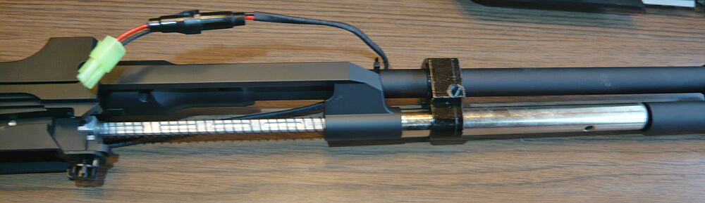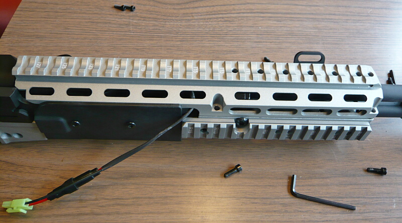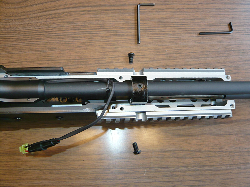 ハンドガード上側を載せ、配線はコッキングレバー前端が当たる位置から出します。(ここは案外コッキングレバー前端とは接触しません)6本のネジを締めて出来上がり。