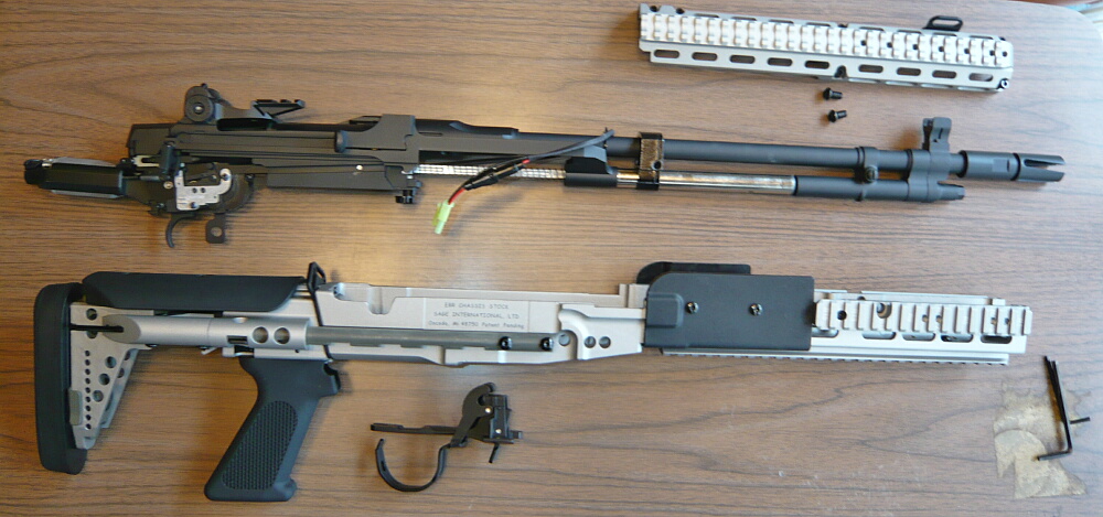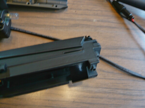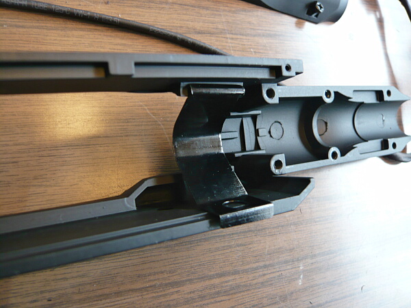 マガジンとバッテリー、トリガーガードを外し、シャーシに後方のモーターをストック基部に差し込むようにして載せます。
