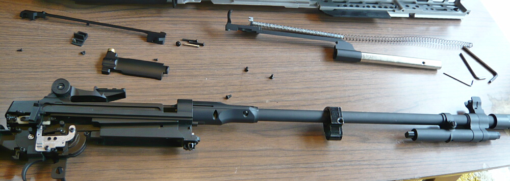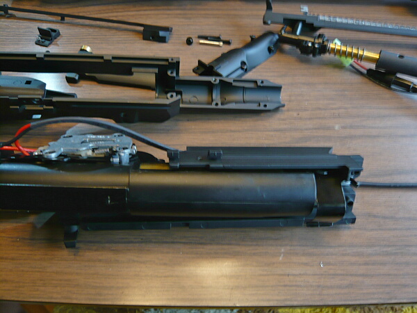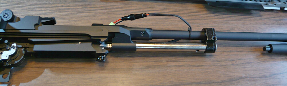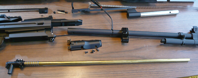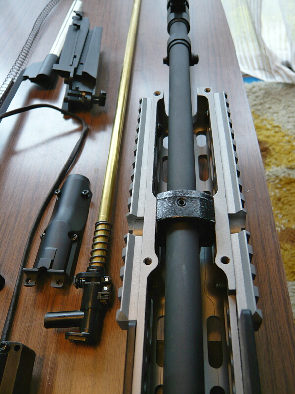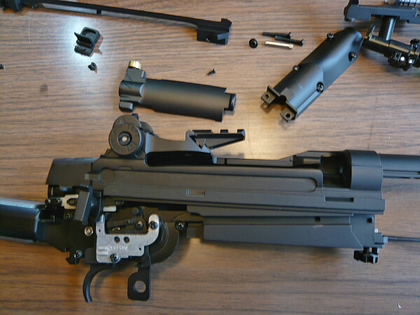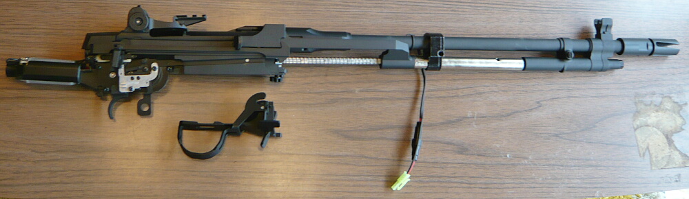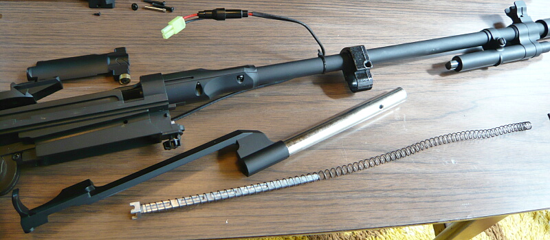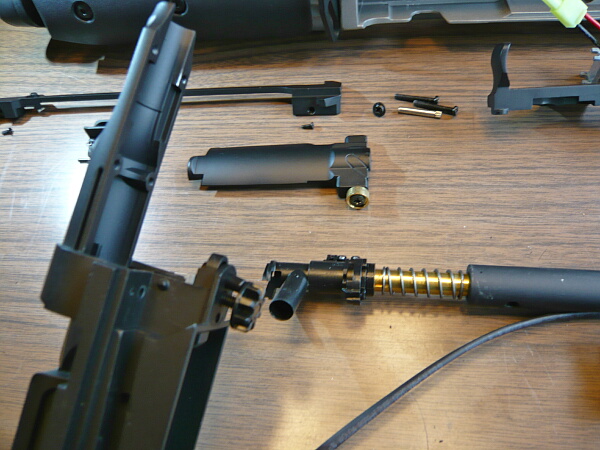 外したパーツを並べたところ。メカボックスから出ている配線がアウターバレルにタイラップで括られたままですが、ここは早期に適当な針金で留め直す形にしておくと良いでしょう。
