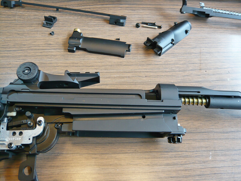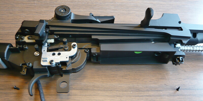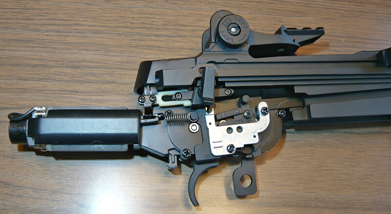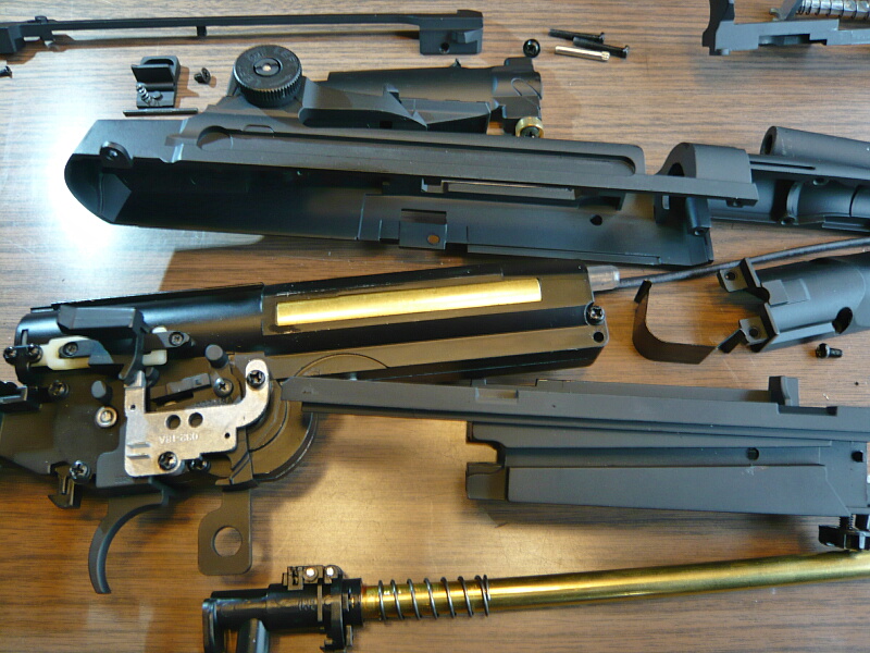 レシーバーが上下に分かれ、メカボックスが露わになりました。メカボックス前端上に被っていた鉄板を曲げたようなパーツがどう取り付いてたかわからなくなってしまった…