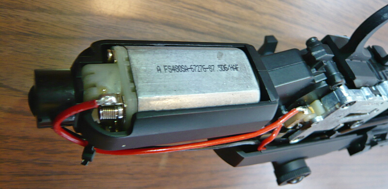 モーターはおなじみの机モーター。グレーの缶に白いエンドベルのトルク型と思しき安いタイプ。Ver.7メカボックスなのでショートタイプかと思います。端子ははんだ付けされています。モーターを交換するにはメカボックスを開ける必要があるので今回はこのままにしておきます。