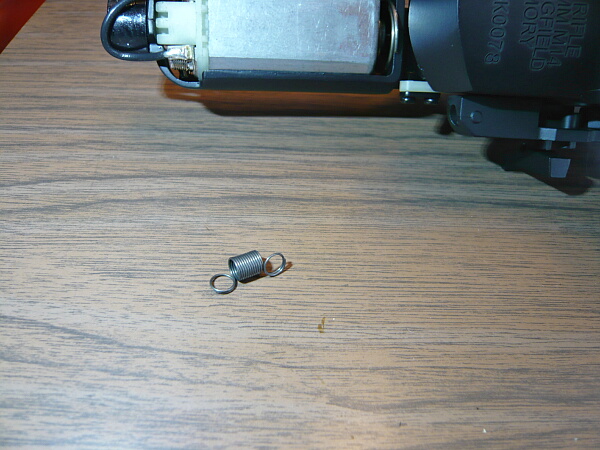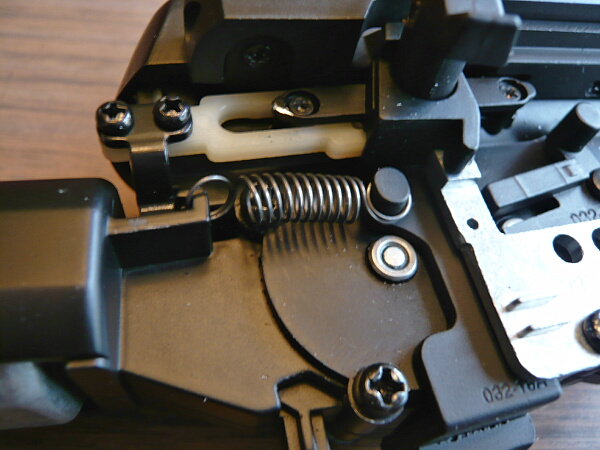 どこのだろう…と見まわすとここ。モーター前方のフックとトリガーの上端にスプリングが掛かっていません。スプリングを掛け直しますが、微妙にポロポロ外れて掛けにくいあたり、ここはどうも外れやすいように思えます。