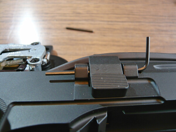 ボルトストップの下にネジが隠れているのでボルトストップを留めているピンを前側から押し出して抜きます。中央にローレット加工のあるピンが刺さっています。