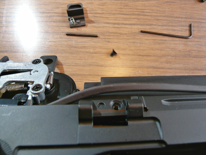 レシーバー下側の左側面に貫通しているスリットがあり、ここに鉄板パーツの左側を差し込まないといけないようす。