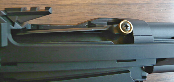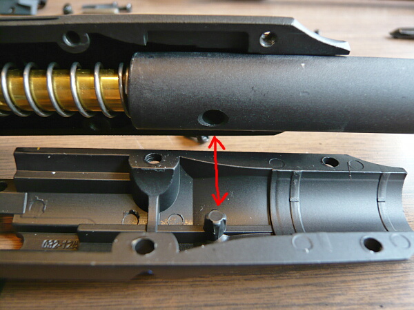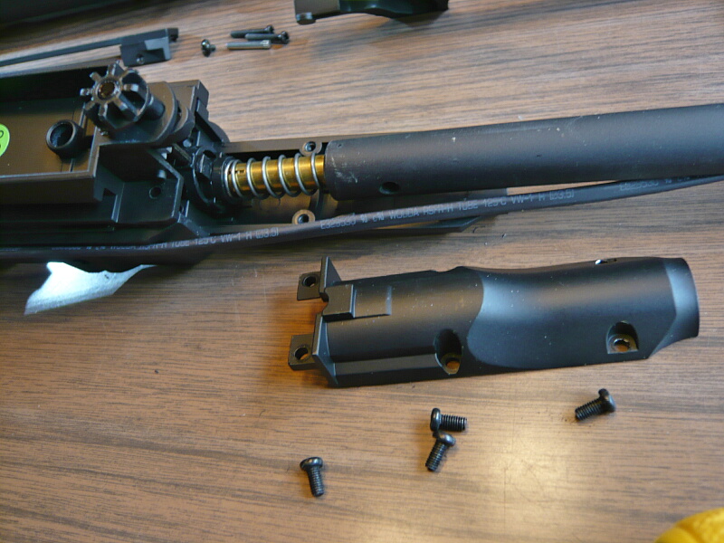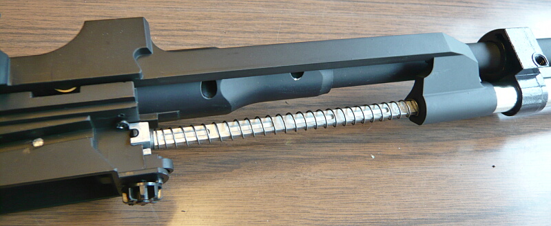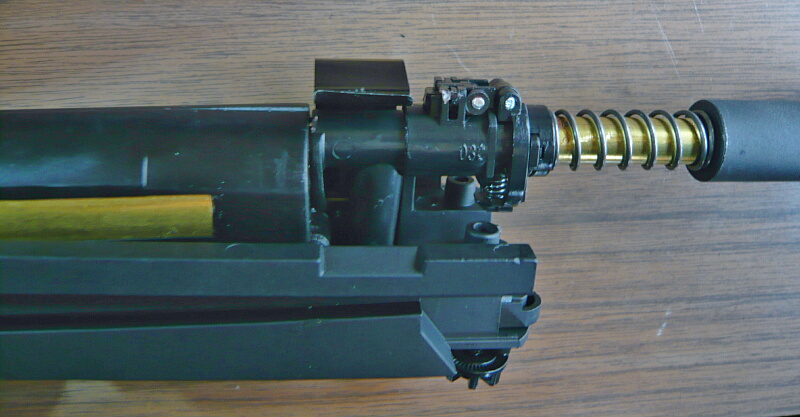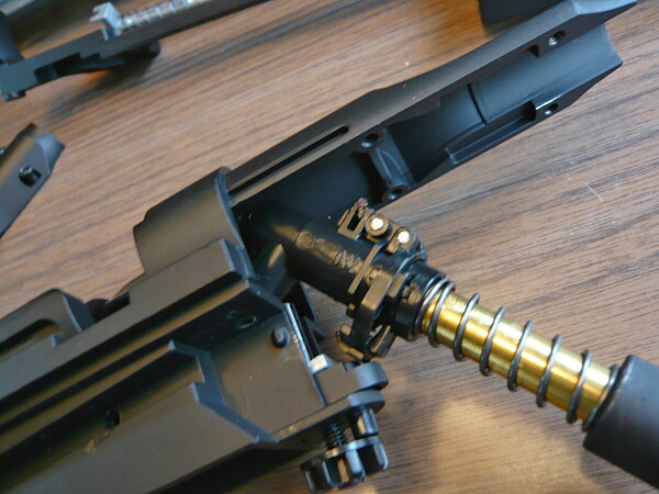 ボルトカバーを差し込み、コッキングレバーを取り付けてバレル下に挿しておいた棒と連結させたらコッキングレバーを最前まで前進させ、リコイルスプリングとガイドを挿し込み、ガイドの後端をホップダイヤルの上にある定位置に横から掛けます。
