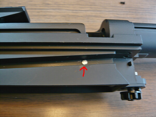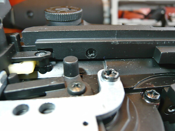アウターバレルとシャーシの結合。左右のネジをしめますが、右側に少し寄るような気持ちで締め、左側はやや緩めにする感じに…