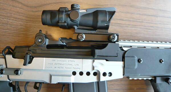ストック基部上のレイルにACOGを載せたところ。このACOGはアイレリーフが短いので割と実用になりますが、さすがにちょっと後ろ過ぎるし、ここのレイルはストックを縮めた時にチークパッドが上に被るので使いにくい。
