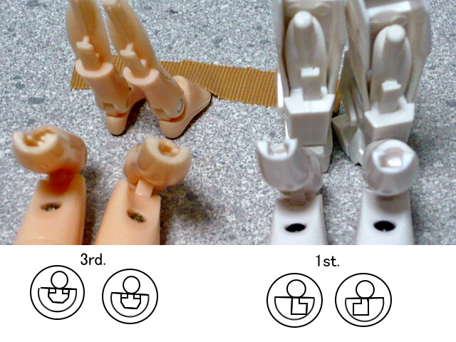 左の肌色が3rd.tall素体、右が1st.であるウェルクストラのスネパーツ。