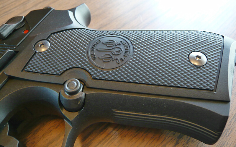ハンマー横の、グリップパネルで覆われてちょっとだけ出ているこの円盤状のパーツ。これがM92FSの証。M9がまだM92Fベースだった頃、スライド中央部の薄くなっているところにウィークポイントがあり、そこでスライドが破断するとスライド後半が射手の顔めがけて飛んでくる危険があったため、ハンマーピンの頭を大きな円盤状にして常時スライド下面の溝に嚙合わせるように改良されました。これにより破断したスライド後半はこのハンマーピンの円盤で受け止めて止まるようになっています。この改良をされたM92FはマイナーチェンジしてM92FSとなりました。そもそも破断しないように部分的に強化された「ブリガーディアスライド」というものもありますが、あまり格好よくないのがどうにも・・・