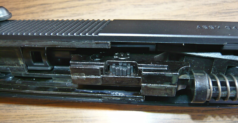 スライド後端左右にあるデコッキングレバーを下げるとハンマーが倒れます。デコッキングレバーの軸にはファイアリングピンの一部が分割して内蔵されており、レバーを下げるとファイアリングピンも45度ほど傾むくため、ハンマーが倒れてもファイアリングピン後端を叩けないため、安全にハンマーダウンさせる事ができます。実銃やモデルガンではさらにリヤサイトの前にオートマチックファイアリングピンブロック(AFPB)があるのですが、さすがにそこは省略されています。
