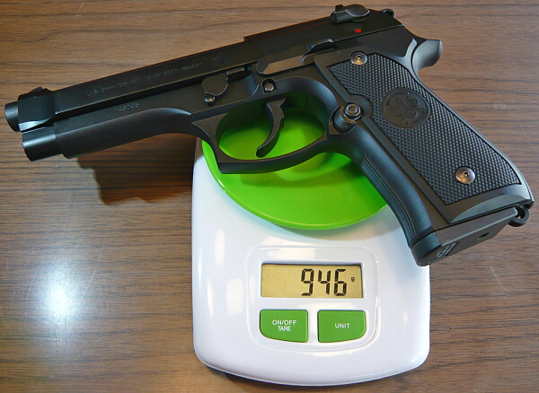 マガジン込みの重量は946g。このくらいのガスブローバックハンドガンは700~800gくらいのものが多いので、持った感じはやけに重く感じます。