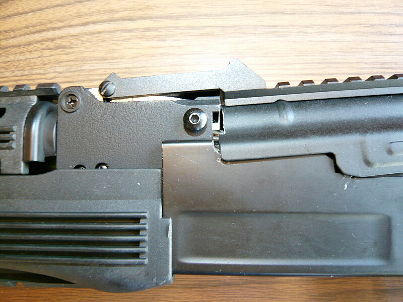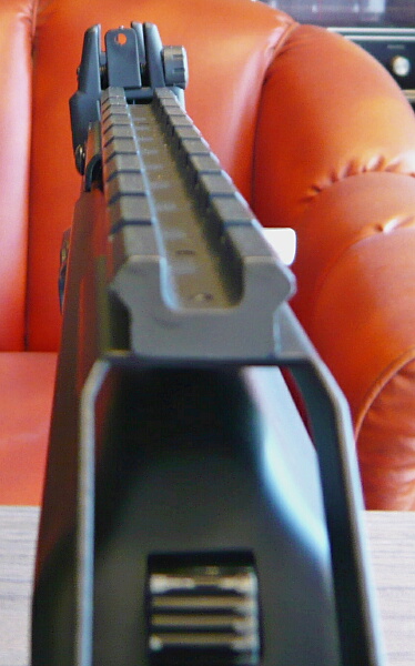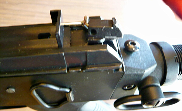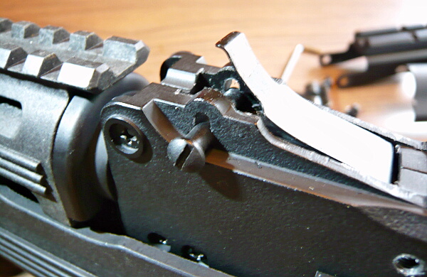 トップレイルを取り付けます。トップレイルは後端がストック付け根上面に飛び出して刺さっているネジに引っ掛けて固定されるので、レイルを後方へ引っ張ってから上に跳ね上げます。ただし先にリヤサイトを跳ね上げてからでないとリヤサイトに引っ掛かって跳ね上げられません。リヤサイトの前側の穴を利用してここを軸にトップカバーごと跳ね上げるタイプのトップレイルに換えてしまいたい気分。