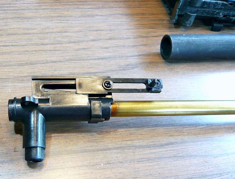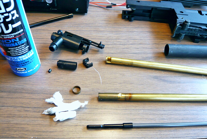 バレル内径が広くなるので短いインナーバレルではアウターバレル内でインナーバレル先端がブレてしまうので長い標準のものに戻します。いやインナーバレル先端外周にアルミテープでも巻いて埋めてやればいいんですが、ハイサイクルカスタムをしたのに結局大したサイクルにならなかったため、短い事のメリットがなくなってしまったので…