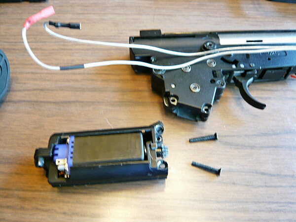 グリップ底部のネジを外してグリップを外します。この銃ではモーターがマルイEG1000ショートに換装済み。