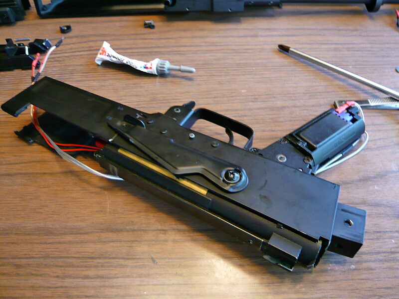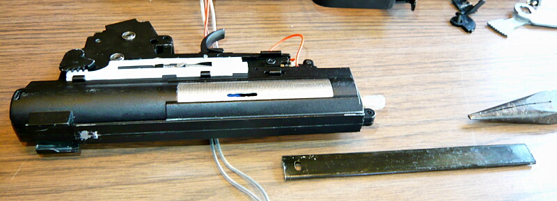 モーターの刺さっていた部分から逆転防止ラッチの解放を行います。引っ掛ける細い工具が必要なのですが、そういう工具は売っていないような・・・自作するか、用を成すもので代用しましょう。メカボックスによっては右側に穴が開いてて細い棒を突っ込んで解放できるものや、S&TのタボールやG36のように銃自体に解放機能があるものもあります。