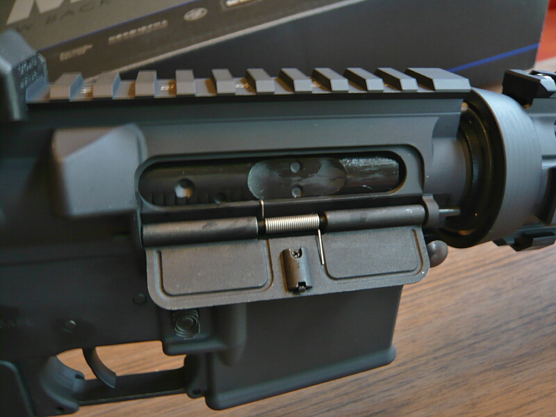 カバーを閉じたところ。チャージハンドルを引くとボルトの後退に連動して自動的にカバーがひらきます。カバーの蝶番の下にクッションが貼られていますが、これカバーが勢いよくレシーバーに当たって傷が付くのを防ぐ初期保護用のもので、剥がしても構わないでしょう。お好みで。