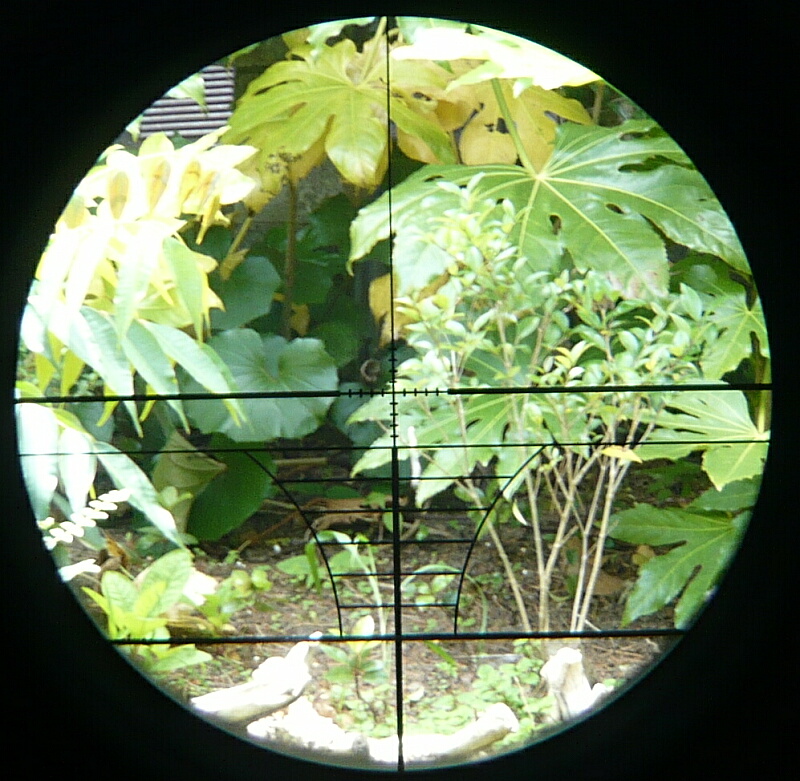 調整後、フルオート射撃しながらスコープの像を撮影したところ。連射中の一発の飛翔中を捉えた写真なので着弾位置はレティクル中央の若干上くらいに来ます。マウントがAK用なのでスコープ位置は銃に対して右にオフセットしているのですが、その割にはレティクル中心よりわずか右側に弾が見え、左右方向はほとんど調整していません。上下方向はレティクル中央より若干下に飛んでいたので中央に寄せていますが、ホップを強めると当然中央より上に飛ぶので、標的の距離とホップ強度の兼ね合いで大体の位置に調整するに留めます。ホップアップ機構のあるエアソフトガンの場合、ホップ強弱で上下方向のゼロイン位置は変わってしまうので、調整をしたらホップはいじらない事になります。しかしサバゲーの場合ゲーム前のパワーチェックでホップを動かされてしまうハズなので、チェック後に再調整するか、狙う前に1発スポット射撃するか、いっそ縦方向はアバウトに捉えるか、各々で考える必要があるでしょう。