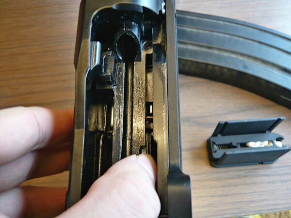 ロックが掛かるまで押し込みます。上写真では律儀に実銃での作法としてチョップでボルトハンドルを止めながら押し込んでいますが、止めなくてもボルトの前進する力が弱いし、クリップが中々スムーズに入って行かないのでそんな余裕もありません。