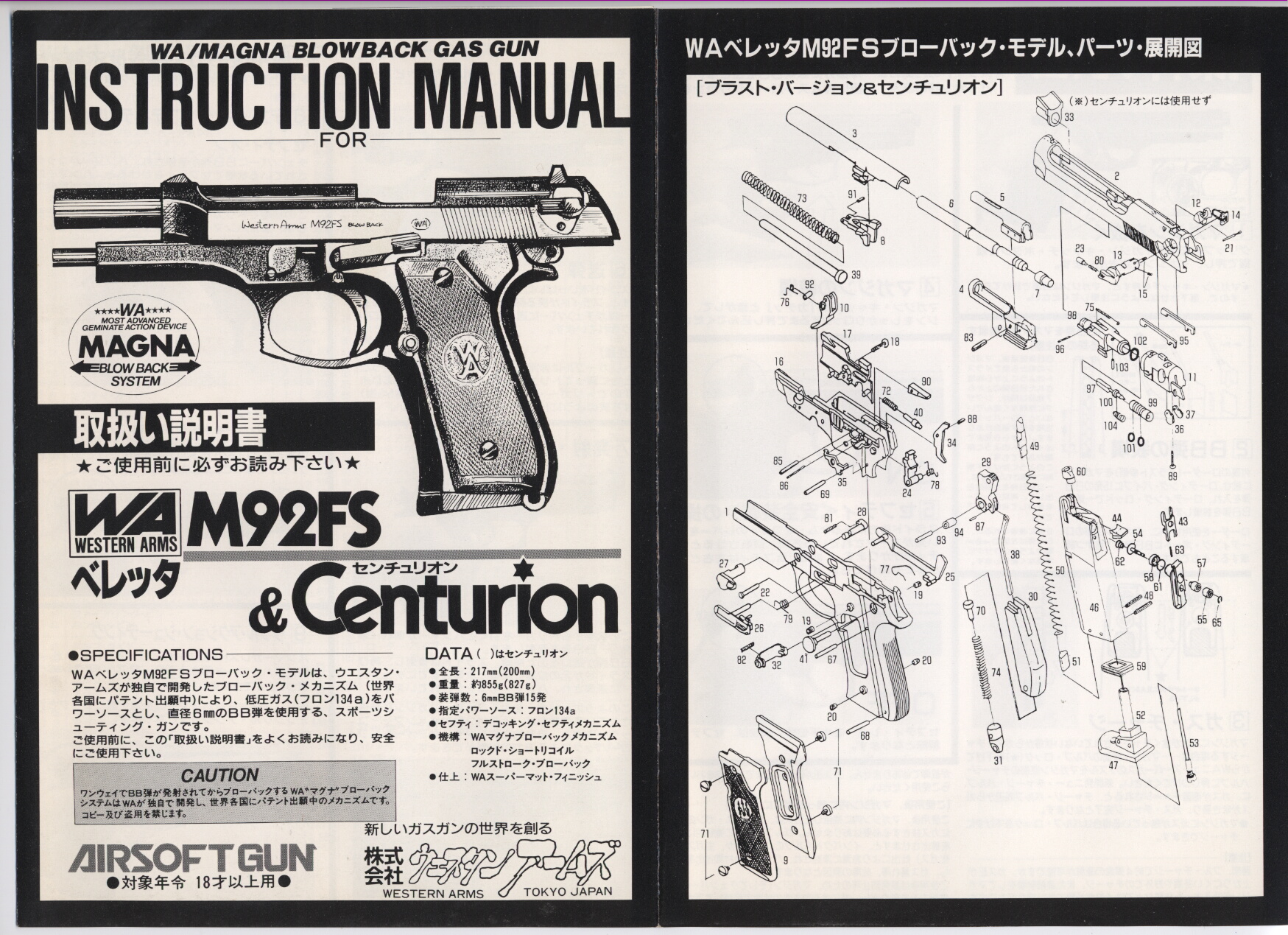 今回はウェスタンアームズのガスブローバックガン、ベレッタM92FSセンチュリオンのマニュアルです。センチュリオンの付属マニュアルですが普通のM92FSと共用のようです。WAのセンチュリオンはヘビーウェイト樹脂で仕上げも美しいものが最近のものでありますが、これは90年代中頃の初期のもの。四半世紀も前のものとはいえモデルガンさながらの通常分解ができて固定ではあるもののHOPUP搭載、ブローバックエンジンがスライド側にあるプレシュートと機構はほぼ完成されており、この銃の登場で実銃同様の分解ができず着弾も大幅に下寄りだったアフターシュートのブローバックガスガンを一気に陳腐化させました。