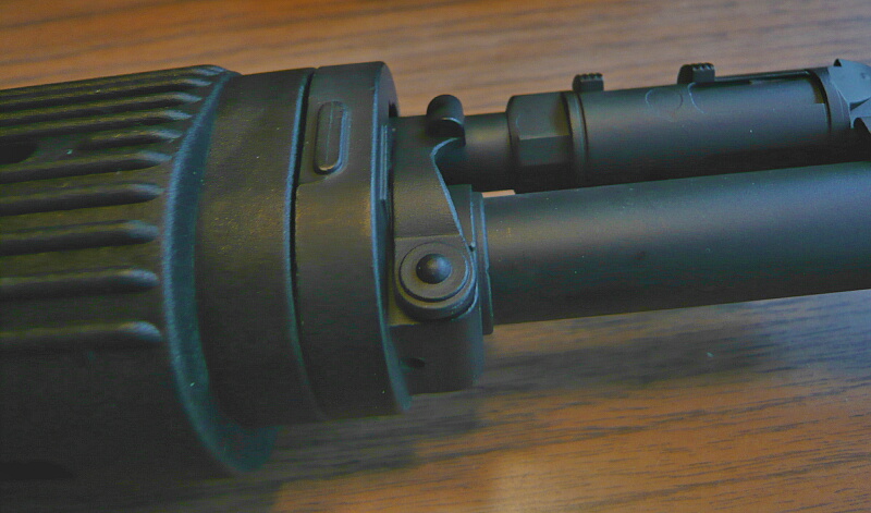 レシーバー右側にはストックを折り畳んだ時に掛けるロック部分が突き出ており、ストックを畳んだ時はチークピースの後ろのスイッチをここへ掛けます。この突き出たパーツはセレクターを一気に下へ下げた時のストッパーも兼ねています。