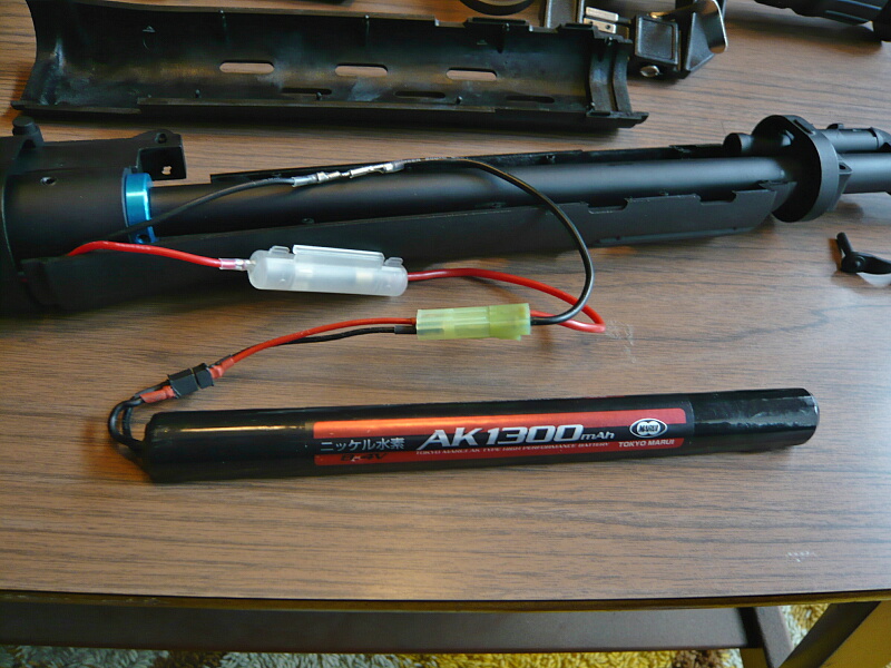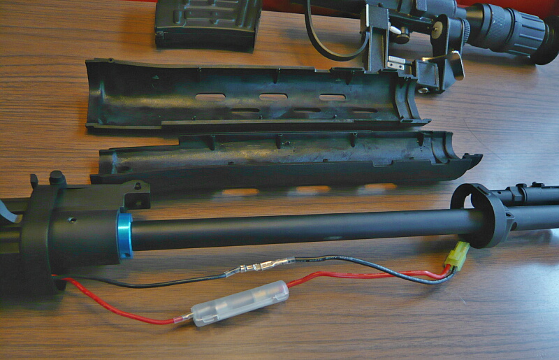ハンドガード後端がレシーバーに刺さっているのでハンドガードを前方へスライドさせ、前後ともフリーになったらハンドガードを左右に割ります。ハンドガードはダボで左右がハメコミになっています。ハンドガードを割って外すと配線が出てきます。バッテリー端子はタミヤミニタイプ。赤い配線の途中にはヒューズボックスがあります。