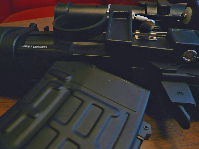 マガジンは金属製のものが付属します。マガジンポート内後方にメカボックスが大きく張り出しているので、マガジン上面後部に大きめの逃げがあります。このマガジン自体はエアコキSVDと共通?RSやCYMAのは上面が真っ平で給弾位置が真ん中にあるので互換はありません。