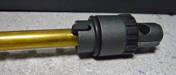 アウターバレル後端にはブルーアルマイト処理された基部があり、その後ろにチャンバーブロックが刺さっています。