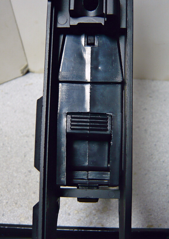 マガジンを前方に押すとストッパーのスイッチが少し後退し、この状態ならストッパーは解除できるでしょう。レシーバーとマガジン後面との間にわずかな隙間ができているので、ここを埋めてやればマガジンを普通に挿してもストッパーがすんなり解除されるかと思います。