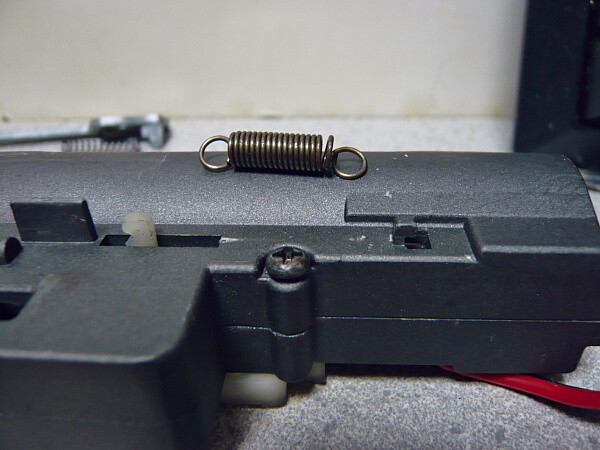 右側面の前方にはスプリングが外側に付いていますが、これは普通の電動ガンだとメカボックス内にあるタペットスプリングです。このメカボックスではタペットプレートの一部が外側に出ており、ここにタペットスプリングが掛けてあります。このスプリングも外しておきます。