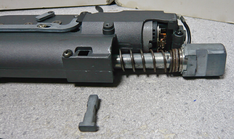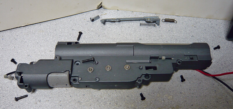 トリガーピンの前方にある斜めを向いたパーツはセレクターの動きをメカボックスを貫通して左側のパーツへ伝達するためのパーツで、これもネジを抜いて外しておきます。このパーツはフルオート動作を行うためだけにあるので、左右とも外すとセミオートオンリーになると聞きます。残る右側にあるめぼしいパーツは前後に伸びる金属パーツ。これはトリガーの動きをスイッチに伝えるトリガーバーです。セレクターがセーフ位置の時はこのトリガーバー下側の段差に引っ掛かってトリガーの動きを止めています。付いたままだと後の作業の邪魔なのでネジ2本を抜いて外しておきますが、長いスプリングが1本隠れているので失くさないように注意。