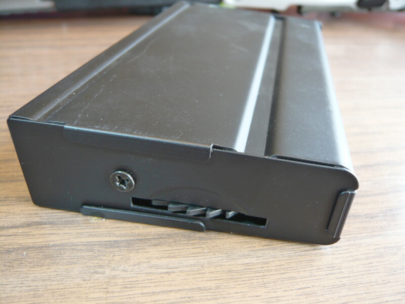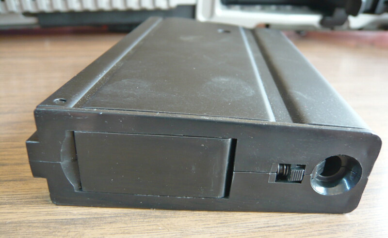 マガジン上面にはフタがあり、ここを開けてBB弾を流し込み、ゼンマイを巻く事でマガジンが使用可能となります。装弾数は400発。