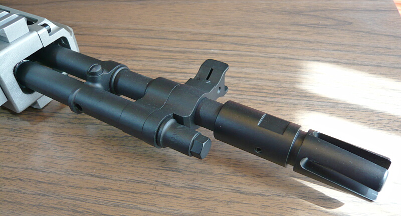 ハンドガードから前に露出したアウターバレル。ハイダーは下にイモネジが刺さっている部分までで、14mm逆ネジタイプ。細いアウターバレル先端に数センチ被さるように取り付いています。