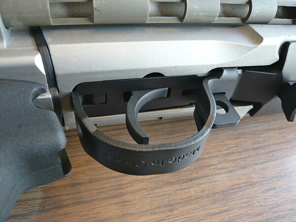 トリガーガード内から押し出すとセーフティOFF。ON→OFFは一瞬ですがOFF→ONはトリガーガードから指を出すだけでは届かないのでグリップを握る手を少しずらさなくてはならず、あまり操作性はよくありません。ON→OFFも普段からトリガーに指を掛けっぱなし前提になってしまうので安全上あまり良いレイアウトではないように思えます。ここは親指で操作するセレクターやセーフティと較べてしまうとツライところ。