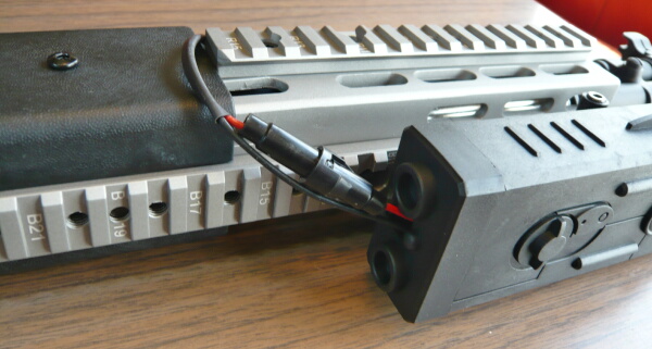 いよいよ実射に入りましょう。バッテリーボックスはハンドガード下のレイルの前半に取り付ければ持つ手の邪魔になりにくいでしょう。左右どちらかに取り付けるとバランスが悪い。M4と違い上に取り付けるとサイトが見えなくなります。