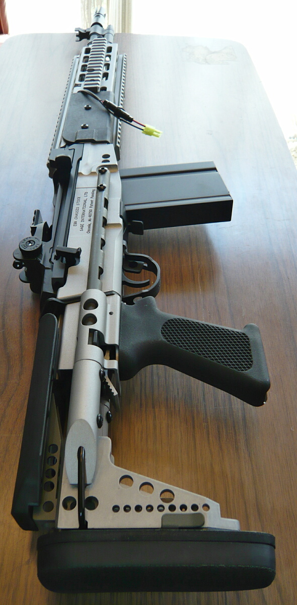 レシーバー付近右側。レシーバー(上部の黒い部分)右にはコッキングレバーがあり、その後方にセミ/フル切り替えのセレクターが生えています。シャーシ右側面には刻印があります。開発したSAGE社の名などが刻まれています。